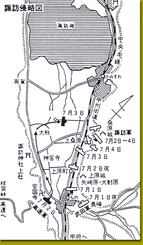 ●同年7月1日夜、武田勢は長峰、田沢に陣。頼重は6月28日には兵を集め始め、矢崎原、犬射馬場まで出陣するが、武田勢の優勢を見て上原城下の十日町へ退却する。